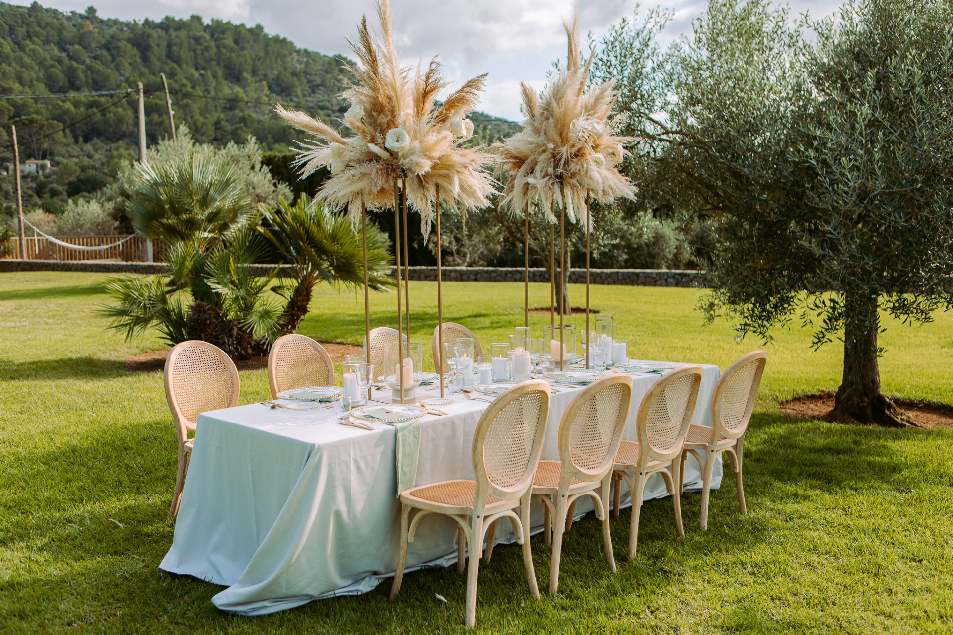 Set against the backdrop of Mallorca's mountains and olive groves, the table design felt effortlessly romantic. The combination of elegant tableware from Exclusive for Events, delicate florals and the refined stationery created a cohesive wedding aesthetic.